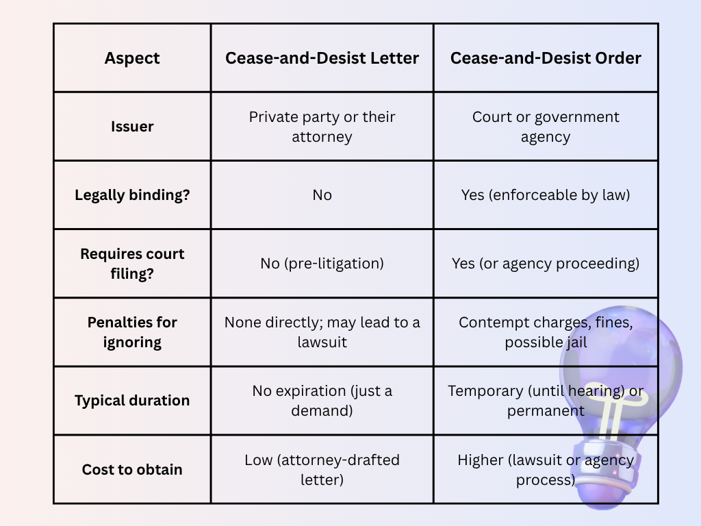 A cease-and-desist order an official directive issued only by a court (as a preliminary or permanent injunction) or a government/administrative agency (e.g., FTC, SEC, NLRB, or state regulators). It specifically orders the recipient to stop the prohibited conduct. It is fully binding and enforceable. Below is a quick comparison chart in the context of US: