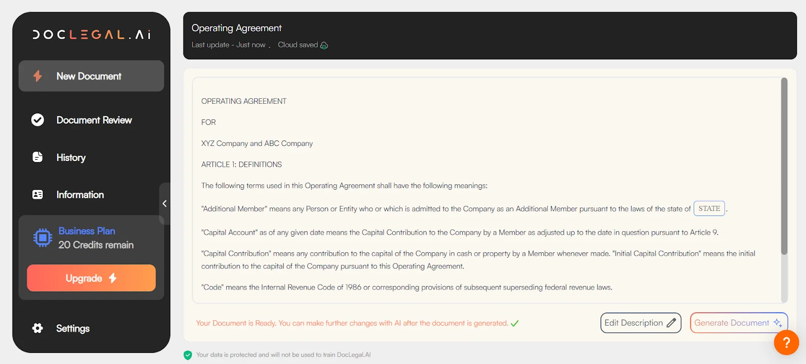 Use DocLegal.ai to draft a operating agreement that clearly ties economics (who gets what) to control (who decides what), then sanity‑check every revision in minutes instead of days.